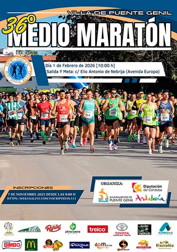 La Media Maratón Puente Genil está organizada por la Delegación de Deportes del Ayuntamiento de Puente Genil y se celebrará el 1 de febrero de 2026. La Escuela de Atletismo Miguel Ríos y el Club de Atletismo Amigos del Canal colaboran en el desarrollo de la popular prueba.